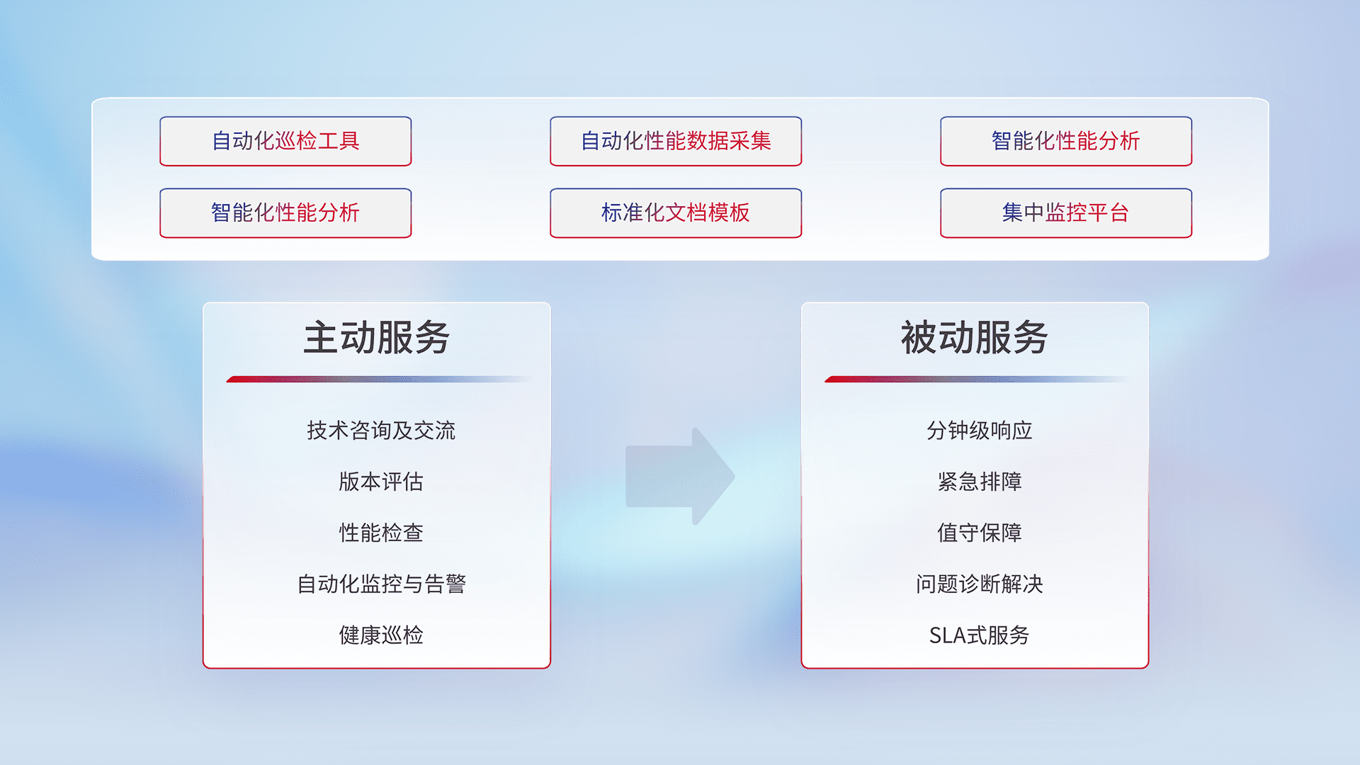 智能化工具和标准化文档,,,,保障服务质量,,,,提供主动服务(包含技术咨询、、版本评估、、性能检查、、、自动化监控与告警、、健康巡检)和被动服务包含(分钟级响应、、紧急排障、、、值守保障、、、问题诊断解决、、、SLA服务)。。。。